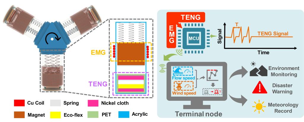 近日,机械自动化工程系田应仲教授和张泉、李龙副教授课题组的以 “Self-sustainable flow-velocity detection via electromagnetic/triboelectric hybrid generator aiming at IoT-based environment monitoring”为题的最新研究成果发表在纳米能源顶级期刊《Nano Energy》(IF: 17.881)。该研究设计了一种新型三缸式混合自供能传感装置,创新性地复合多种形式能量,突破功能结构-传感技术一体化融合难点,实现基于物联网的远节点超时空智能感知。