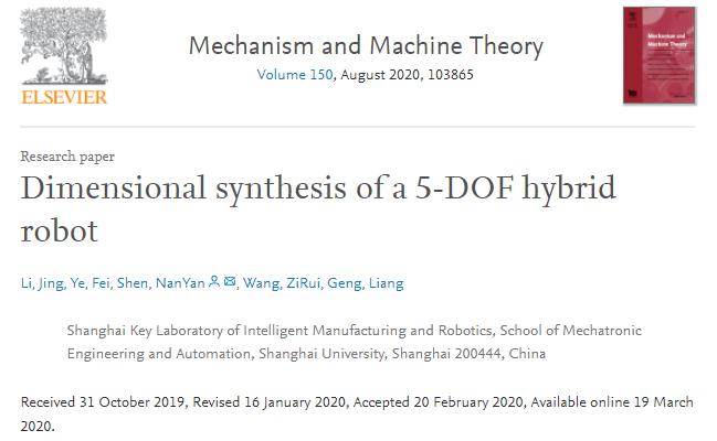 机自学院机自系副教授李静老师及其团队,在SCI一区(工程:机械)TOP期刊《Mechanism and Machine Theory》(MMT,CS=4.48,IF=3.535)上发表了题为“Dimensional synthesis of a 5-DOF hybrid robot”的论文,188金宝搏中国官网