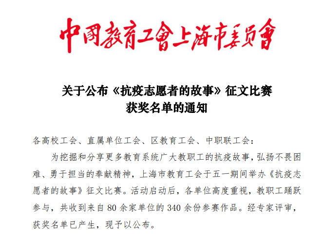 为挖掘和分享更多教育系统广大教职工的抗疫故事,弘扬不畏困难、勇于担当的奉献精神,上海市教育工会于五一期间举办了《抗疫志愿者的故事》征文比赛。机自学院机自系教师赵旻以疫情期间担当志愿者的亲身经历投稿参与了本次活动。