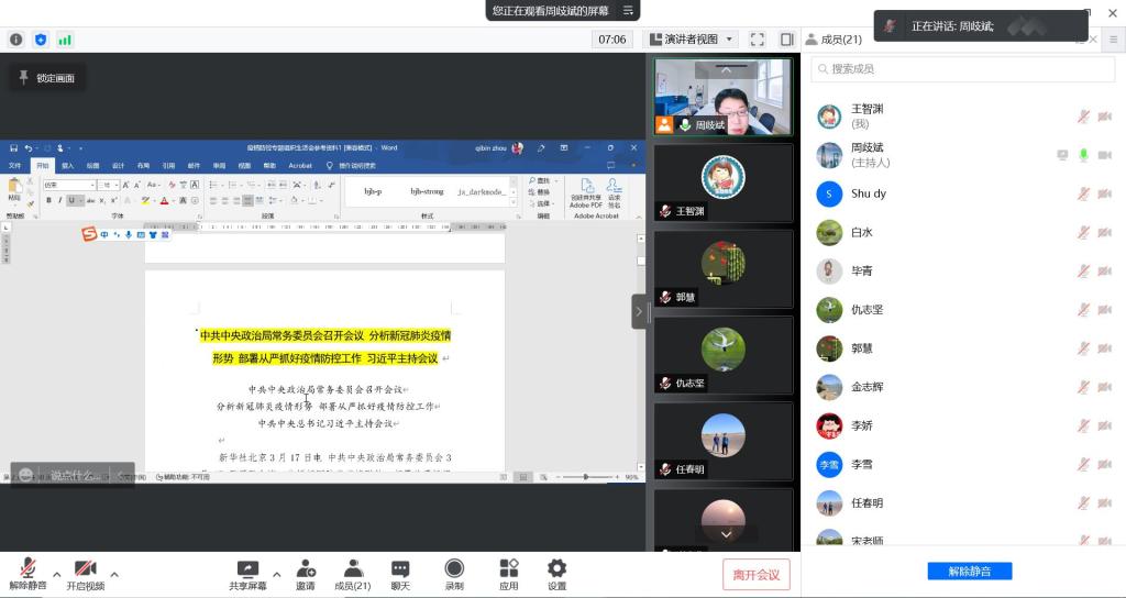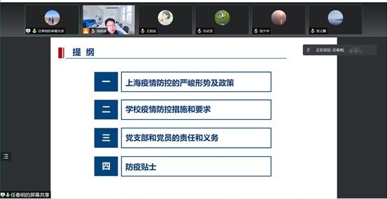 支部副书记任春明老师介绍了上海疫情防控的严峻形势、相关政策,以及学校最新的疫情防控措施和要求。他建议老师们通过上海发布和学校网站主页“上大战疫进行时”及时了解上海和学校最新的疫情信息;并再次强调严格遵守党支部和党员的责任和义务,疫情期间坚持听从指令,坚持每日一报,坚持足不出户,坚持全员核酸,教师党员走在前、做表率,不信谣、不传谣,积极传播正能量。