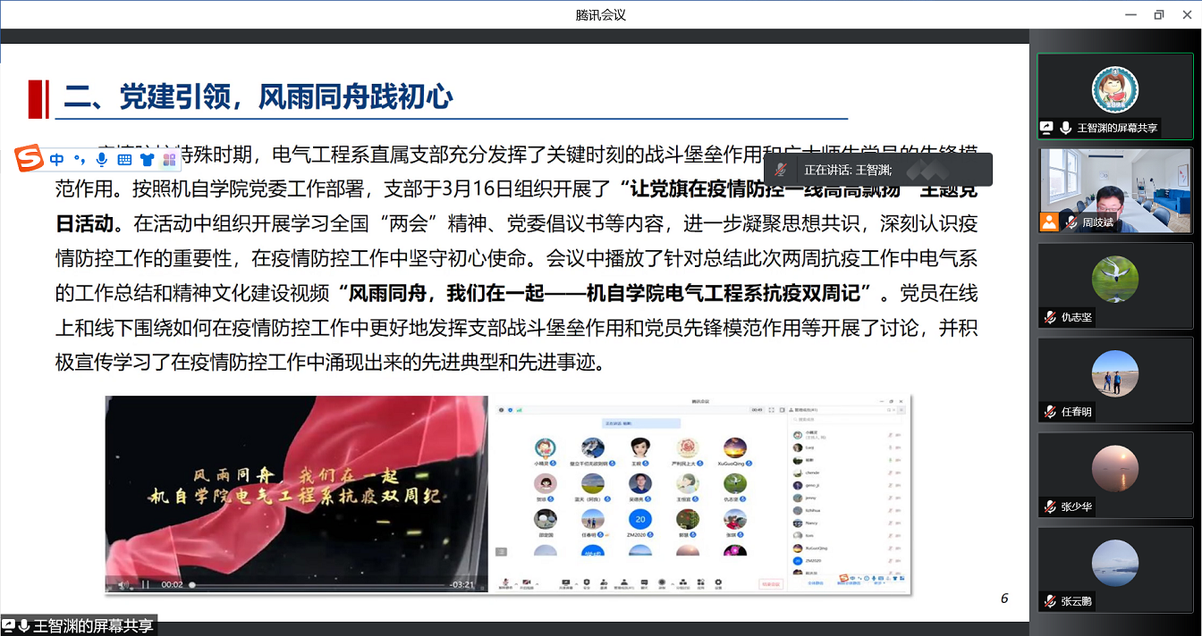随后,支部组织委员王智渊老师汇报了电气工程系近期疫情防控相关工作情况。电气工程系在疫情期间能统筹部署、全局谋划、细致安排,及时落实全系教师网格化管理方案,组建志愿服务队、储备防疫必需品;了解师生的实际困难,帮助协调解决;全力保证在线授课顺利开展,封控不停教,抗疫不停学;组织策划连续两场的“领航计划——教授和青年老师云上交流座谈会”及一对一的青年教师基金申请指导;坚决执行“双报到”,主动报名参加到社区抗疫志愿工作。王老师指出,电气工程系全体教师一直以来展现出的乐观与团结,定能共克时艰。
