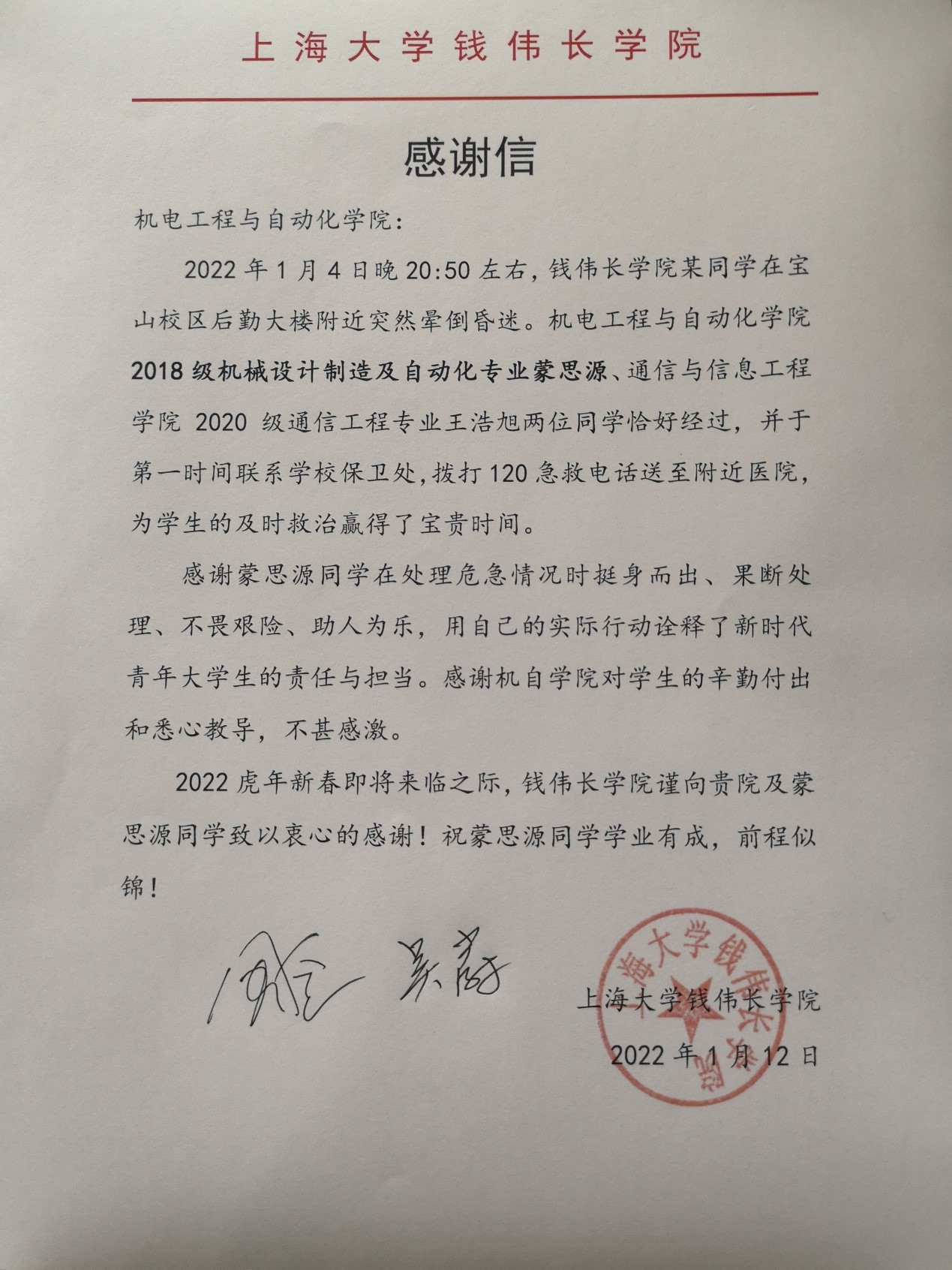 1月12日,我院收到钱伟长学院发函过来的关于蒙思源同学的感谢信。我院2018级机械设计制造及其自动化专业蒙思源同学,于1月4日晚在宝山校区发现有同学晕倒昏迷,第一时间联系保卫处并拨打120急救电话,将晕倒学生送至医院,使该同学得到了及时救治。蒙思源同学的这种挺身而出的行为,展现了机自学院学子乐于助人、勇于担当的良好风貌,诠释了新时代青年大学生的责任与担当,值得全院学生学习。
