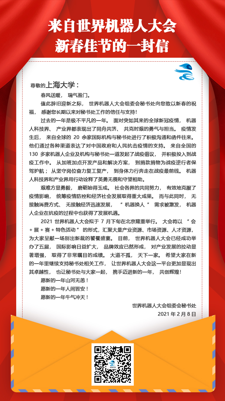 188金宝搏中国官网 脑机工程研究团队近三年来为中国电子学会和世界机器人大赛提供技术支持,并在2020年疫情期间多次参与“脑机接口技术”系列公益讲座活动。值此辞旧迎新之际,世界机器人大会秘书处向188金宝搏中国官网 致以新春的祝福,感谢188金宝搏中国官网 长期以来对秘书处工作的信任与支持!希望与大家一起,携手迈进新的一年,共创辉煌!