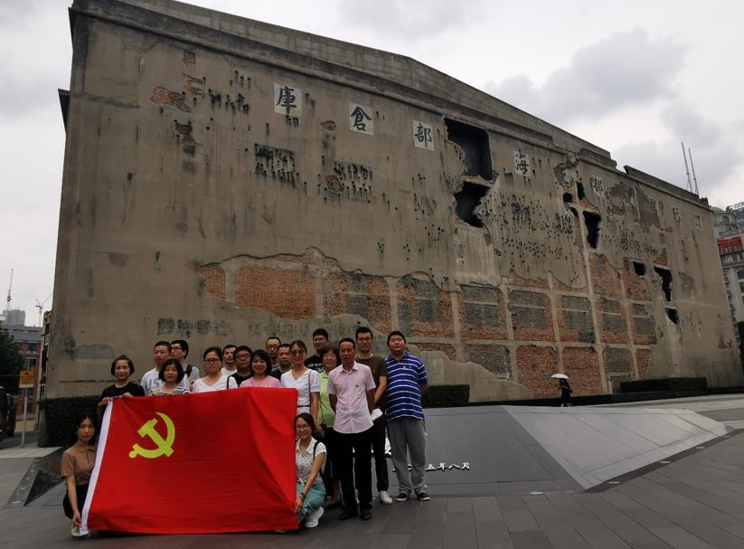 最后,党员们怀着崇敬的心情来到晋元纪念广场,抬头凝望四行仓库西侧山墙至今还保留着的密集弹孔和被炮弹打出的缺口,再次被英雄们英勇顽强的壮举与精神所打动,深刻体悟到了新中国成立的艰辛与不易。在厚重的历史面前,党员们深刻感受到了现在和平幸福生活的来之不易,在如今抗击疫情的大背景和“四史”学习的氛围中,大家纷纷表示要铭记历史,不忘初心,践行习近平总书记所述的“最深层、最根本、最永恒的社会主义核心价值观”——爱国主义,进一步让爱国主义成为信念、力量和行动的源泉,在各自的平凡岗位上也要努力发出自己的一份光,发出自己的一份热。