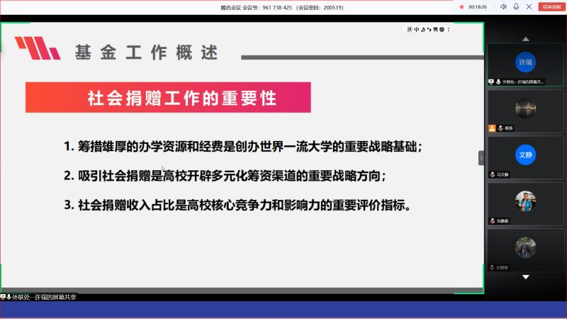 首先仇静豪副书记整体介绍了我院今年的社会捐赠任务指标、目前的完成情况以及学校、学院为鼓励广大教师积极参与社会捐赠项目所制定出台的相关政策。接着许瑞处长从基金工作概述、捐赠项目类别、捐赠项目管理、配比项目解读等几个方面详细讲解了社会捐赠工作的内涵、实施细则以及重要意义。随后各与会人员就若干具体问题与许瑞处长进行了深入交流。最后,于瀛洁书记对对外联络处领导为我院社会捐赠工作做出的指导和帮助表示感谢,并激励大家要齐心协力、共同努力、多措并举、全员联动,确保2020年社会捐赠工作圆满完成。