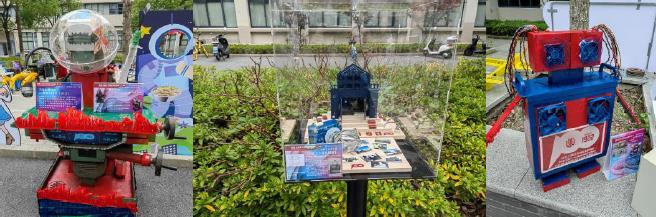 党的二十大报告指出“要推动形成绿色低碳的生产方式和生活方式”,在装置艺术学生作品展区中,学院把“锈迹斑斑”的废旧实验设备——电容器、电线、电机、机床等作为教育教学的宝贵素材,结合低碳目标,同学们通过工业设计表现技法、计算机平面设计等课程对其进行改造,大量废旧实验设备变成独具美感的工艺品,例如电路板改造的老上大建筑模型、花辫机器人、做饭小青龙等。此外,师生还通过互动体验、展板、留言等方式向党和祖国表真情、送祝福,把“初心”和“使命”融入到师生各项工作和生活中!