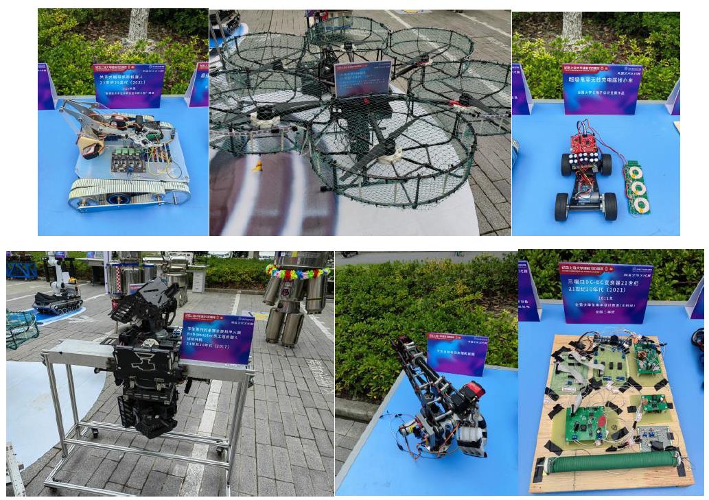 在学生科创作品展区,展出了“国家级大学生创新创业训练计划”项目关节式履带抓取机器人,全国大学生电子设计竞赛(本科组)全国二等奖三端口DC-DC变换器等,全国大学生智能汽车竞赛四轮组、单轮组参赛小车,特别是188金宝搏中国官网
