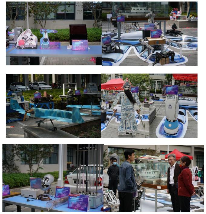 在设备装置历史沿革展区,展出了20世纪80年代获得上海科学进步一等奖的“上海二号”和获得863计划智能机器人主题支持的“垂直壁面爬行机器人”展板,20世纪90年代(1997)的微小管道探测机器人系统,21世纪00年代(2009)在第十一届上海国际工业博览会上展出的“京剧表演机器人”,21世纪10年代(2016)获得第十八届国际工业博览会高校展区一等奖的多型仿生四足机器人,2011年获得上海市技术发明一等奖的“基于探测机器人技术的水域安全检测监控系统”的世博会扫测艇,2019年抗击新冠肺炎疫情中在龙华医院、第十人民医院使用过的高污染危险环境智能消毒机器人等。
