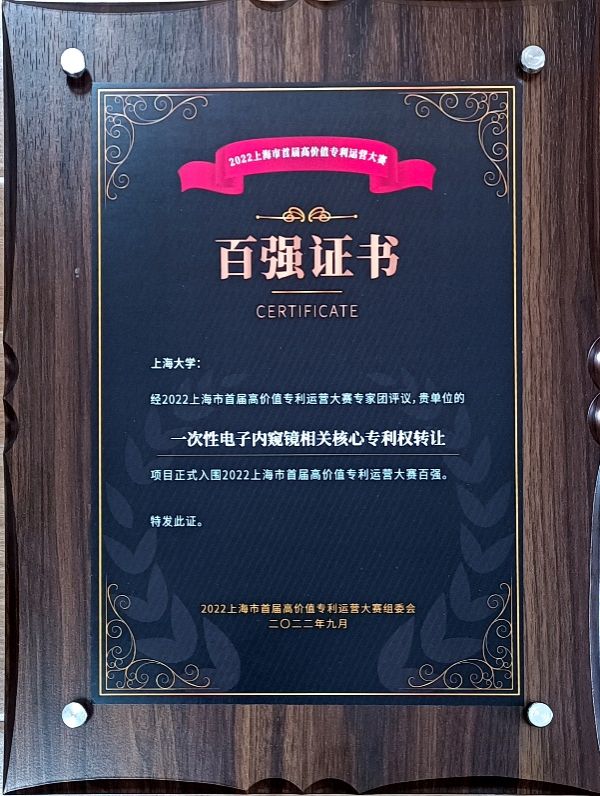的“一次性电子内窥镜相关核心专利转让”项目入围百强榜单。周文举教授带领团队聚焦机器视觉与医工交叉领域,研发多项智能视觉医药检测生产设备和医疗诊治仪器,其中,研发的一次性智能电子内窥镜,改善了电子内窥镜成像效果不足和智能化程度低等问题,形成了一系列创新专利技术。一次性智能电子内窥镜为医师提供更清晰的内镜视野、更精准的诊疗和更安全的内镜使用,为我国医疗电子内镜的发展提出了上大方案。项目成员充分发挥自己的学科优势,积极准备每一场比赛,在竞争激烈的比赛中不畏困难,勇于探索,充分体现出上大学子的创新精神和技术素养。项目经过层层赛选,最终在入选的近三百个高价值专利项目中脱颖而出,入围百强榜单,188金宝搏中国官网