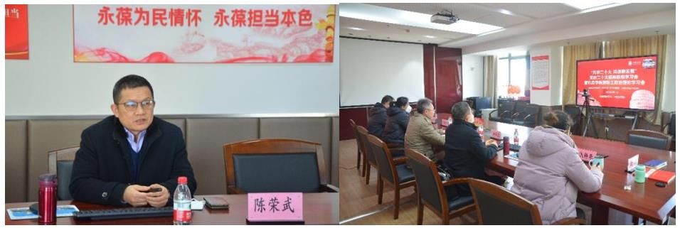 随后,为学习宣传贯彻党的二十大精神,提高党建联建工作水平,聚合力促发展,机自学院邀请了陈荣武教授作《全面建设社会主义现代化国家新征程的政治宣言和行动纲领一一学习贯彻党的二十大精神》主题讲座,讲座线上线下同步进行,与会三家单位党政班子全体成员以及机自学院全体教职工参会学习。