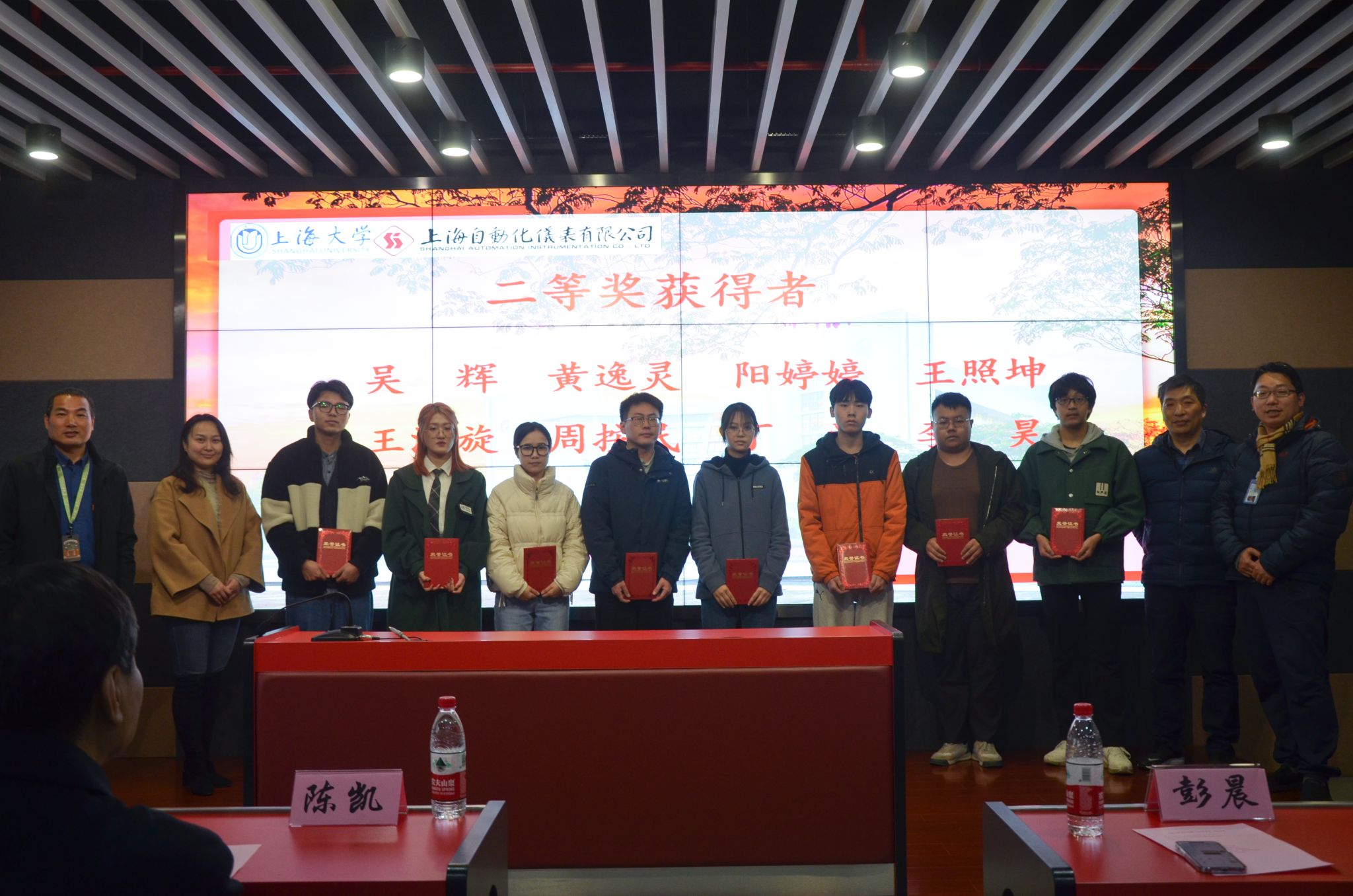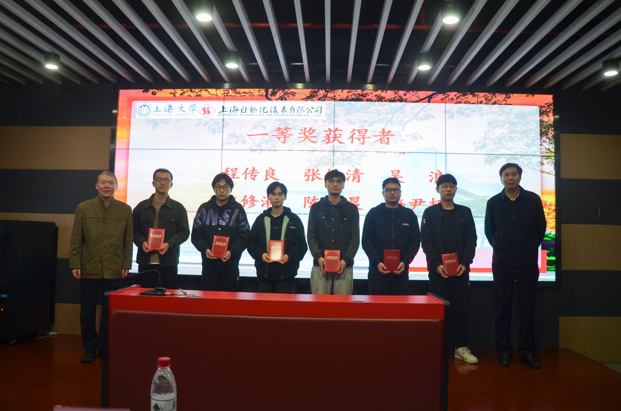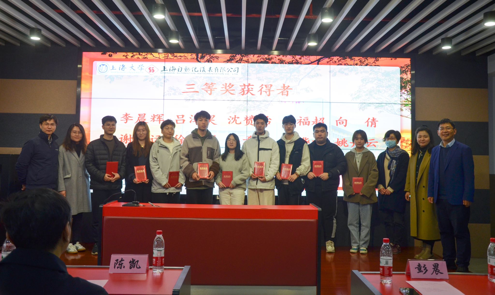 最后,王舒憬老师宣读了2022年度“自仪奖学金”获奖的24名研究生和本科生名单。由自仪公司领导和机自学院的与会院系领导共同为获奖学生颁发证书,并且与获奖学生合影留念。