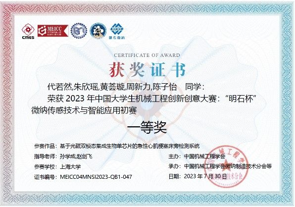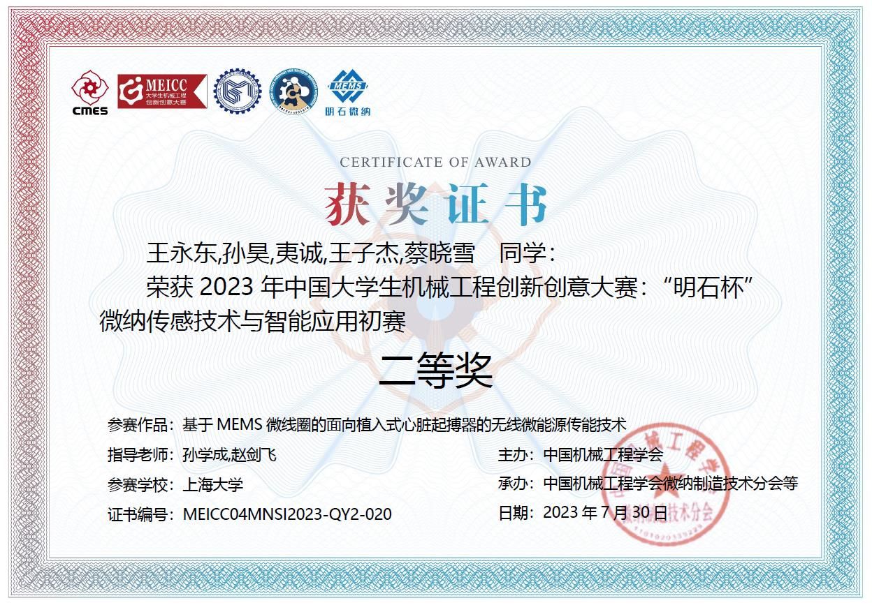 电气工程系副教授赵剑飞和孙学成联合指导本科生团队代若然、朱欣瑶、黄荟璇、周新力、陈子怡,研究生团队王永东、孙昊、夷诚、王子杰、蔡晓雪,分别荣获2023年中国大学生机械工程创新创意大赛:“明石杯”微纳传感技术与智能应用赛初赛全国一等奖和二等奖,参赛题目分别为“基于光磁双模态集成生物单芯片的急性心肌梗塞床旁检测系统”和“基于MEMS微线圈的面向植入式心脏起搏器的无线微能源传能技术”。比赛云集了来自西安交通大学、上海交通大学、北京航空航天大学、北京大学、中国科学技术大学、浙江大学及中国科学院微电子所、声学所等27所高校和科研机构的58支参赛团队,展示了一大批有创意、有内涵、有丰富想象力和创造力的作品。