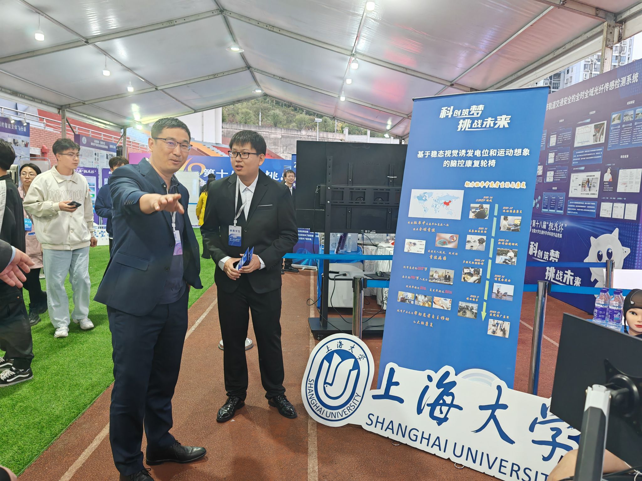 10月27日至31日,由共青团中央、中国科协、教育部、中国社会科学院、全国学联、贵州省政府共同主办的第十八届“挑战杯”全国大学生课外学术科技作品竞赛在贵州大学举办。经过项目展示、现场答辩等环节的激烈角逐,我院参赛作品《基于稳态视觉诱发电位和运动想象的脑控康复轮椅》荣获全国主体赛道二等奖!大赛期间,校党委常委、副校长聂清老师慰问了团队师生,团上海市委挂职副书记唐志宇到作品展台参观调研作品。