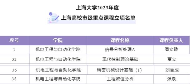 近日,上海市教委发布《上海市教育委员会关于公布2023年度上海高校市级重点课程立项名单的通知》(沪教委高〔2023〕38号)。188金宝搏中国官网 共44门课程获批立项,其中机自学院共4门课程获批立项。