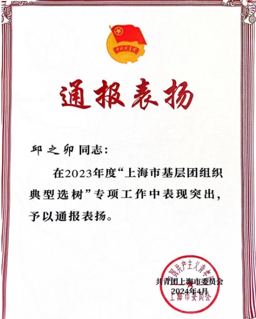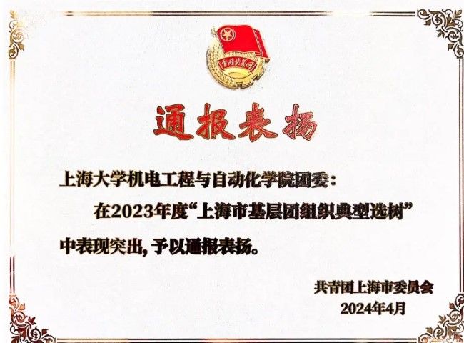 在2023年度上海市基层团组织典型选树工作评选中,金宝搏188介绍 团委获集体通报表扬,机自学院团委书记邱之卯获个人通报表扬。