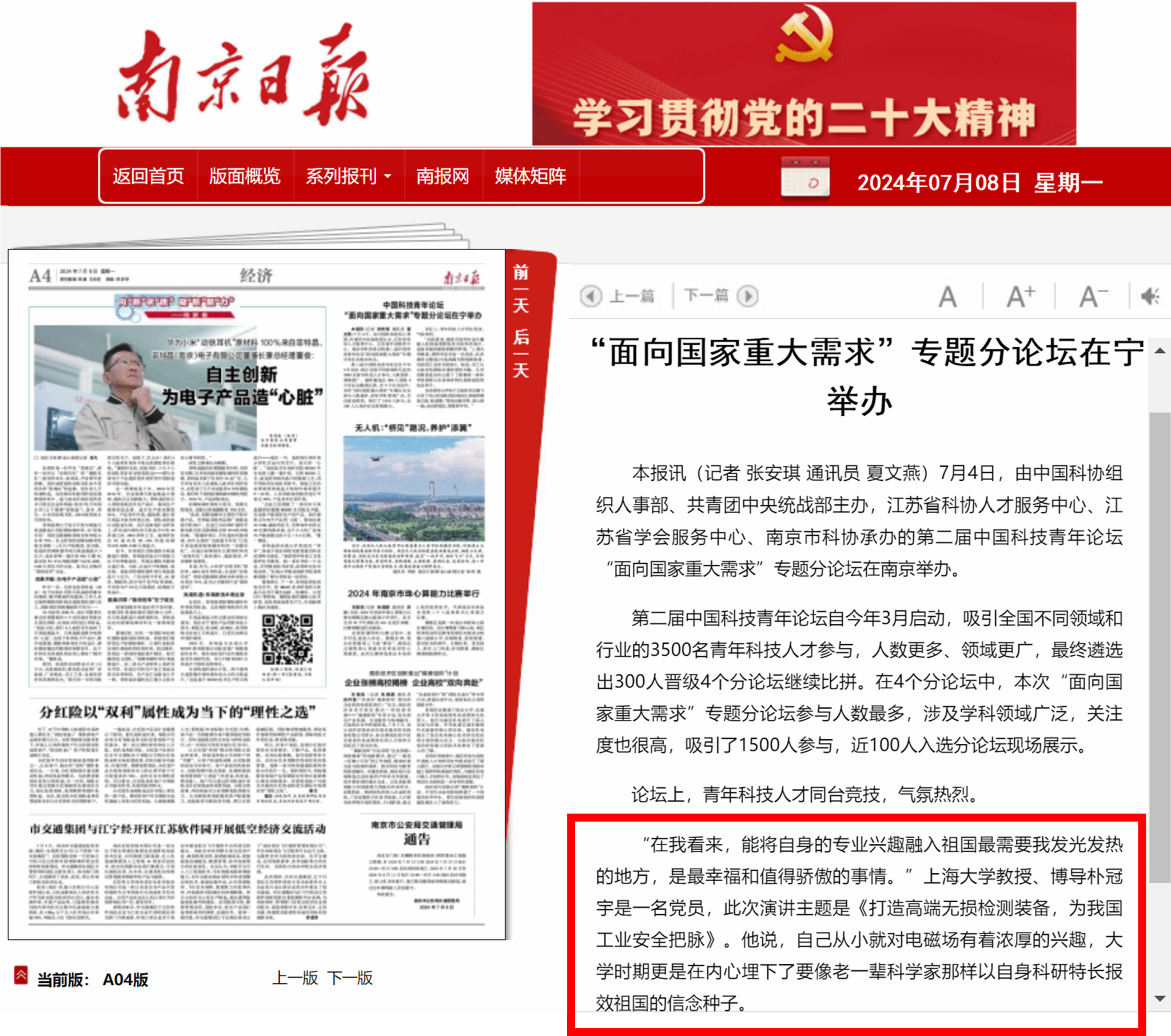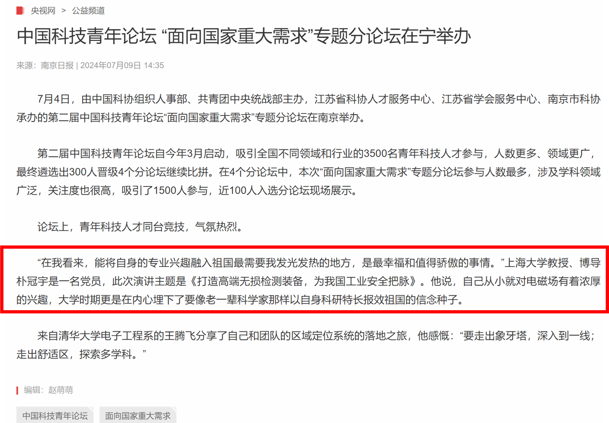 朴冠宇教授的主题演讲展现了青年科研工作者为建设我国科技强国攻坚克难的精气神,得到了在场评委们的一致认可,受到了央视网、南京日报、搜狐网、新浪网等多家媒体的典型宣传报道。朴冠宇教授代表188金宝搏中国官网