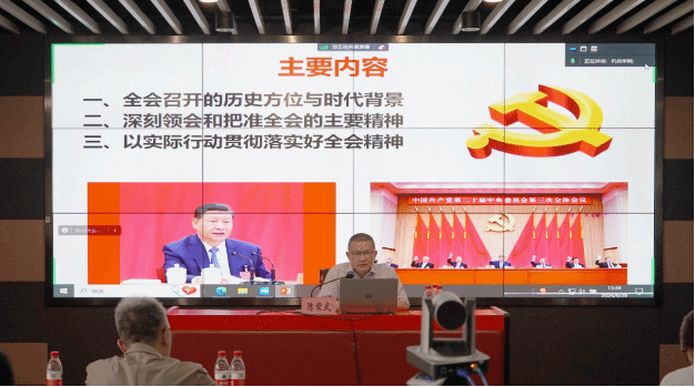 陈荣武教授将报告分为全会召开的历史方位与时代背景、深刻领会和把准全会的主要精神和以实际行动贯穿落实好全会精神这三大板块,系统梳理全会报告中关于全面深化改革,推动高质量发展,加强党的全面领导等关键内容,分析当前经济社会转型的时代背景,强调全体党员要结合自身实际岗位、勇于担当作为,切实把思想和行动统一到全会精神上来。陈教授用生动的实例剖析理论观点,引导与会师生将学习贯彻全会精神同学习领会习近平总书记关于全面深化改革的一系列新思想、新观点、新论断结合贯通起来,推动实际工作取得新的突破。