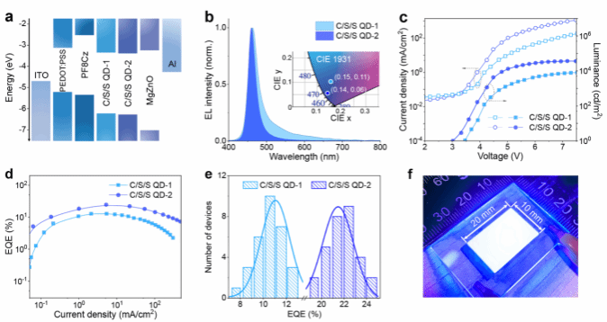 量子点显示以其更为优秀的色彩表现力,已成为引领新型显示产业迭代升级的关键驱动力之一。近期,科学家们对誉为终极量子点显示技术的电致发光量子点发光二极管的研究与探索持续发力,取得了令人瞩目的突破性进展。目前,红、绿光QLED性能已能够与商业有机LED (OLED)相媲美。而相比之下,由于更高的工作电压及需要克服更大的空穴注入势垒等原因,导致蓝光QLED器件性能进展落后,尤其是环境友好型的无重金属器件的发展更为迟缓,严重阻碍了QLED显示技术的商业化进程。