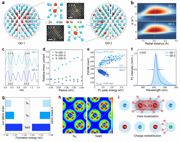 为解决这些关键难题,研究团队提出了一种通过等电子调控抑制含Te量子点组分不均匀的策略,通过引入具有适当反应活性的亚磷酸三苯酯(TPP-S),一方面能够使TPP平衡阴离子的反应活性,另一方面吸电子能力更强的S能够干扰Te周围的空穴局域化并避免Ten≥2等电子中心形成,成功制备出均质化的四元合金蓝光ZnSeTeS量子点。相比传统ZnSeTe量子点,ZnSeTeS量子点在色纯度、激子辐射复合和结构稳定性等方面实现大幅提升。基于该四元量子点构建的蓝光QLED器件显示出24.7%的外量子效率,17 nm的发光半峰宽以及接近3万小时的T50寿命,突破了无重金属的纯蓝光QLED发光效率和稳定性的新纪录。这一重要研究进展将推进QLED显示技术的环保化进程。