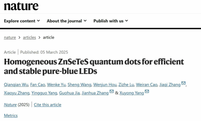 新型显示技术及应用集成教育部重点实验室杨绪勇教授、张建华教授团队联合吉林大学张佳旗教授团队以“Homogeneous ZnSeTeS Quantum Dots for Efficient and Stable Pure Blue LEDs”为题,在国际顶级学术期刊《Nature》上发表关于环保型蓝光量子点发光二极管(QLED)的突破性研究文章。论文链接:https://www.nature.com/articles/s41586-025-08645-4