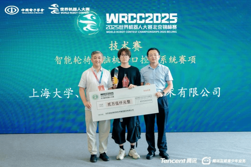 我院研究生齐世航、夏春骏以及上海韶脑传感技术有限公司技术人员郑思羽、季梦寒、赵方德等队员组成的445NKLY队,荣获“智能轮椅的脑机接口控制系统赛项”特等奖(全国冠军)。该赛项从整体的角度,比拼赛队在范式、算法、交互、系统开发、人机协同方面的能力,促进脑机接口技术在医疗健康领域的迭代与应用。