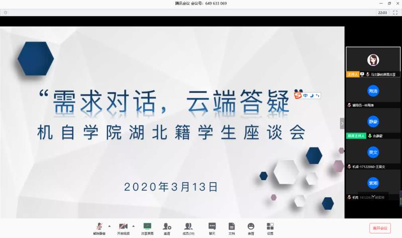 为深入了解湖北籍学生生活和学习情况,切实帮助学生解决面临的困难,增强学生战胜疫情的信心。3月13日晚上和3月14日上午,机自学院党政领导分别与学院在鄂本科生、研究生进行了两场座谈会,倾听心声,传递关怀。
