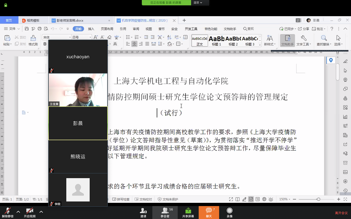 会议由研究生辅导员王佳寅老师主持。机自学院副院长彭晨教授率先致辞,介绍了疫情发生以来,学院为保障和服务同学们的生命健康和教学秩序所做的各项努力,尤其是将毕业班纳入优先考虑的群体,对论文答辩、就业等工作进行了统筹谋划。