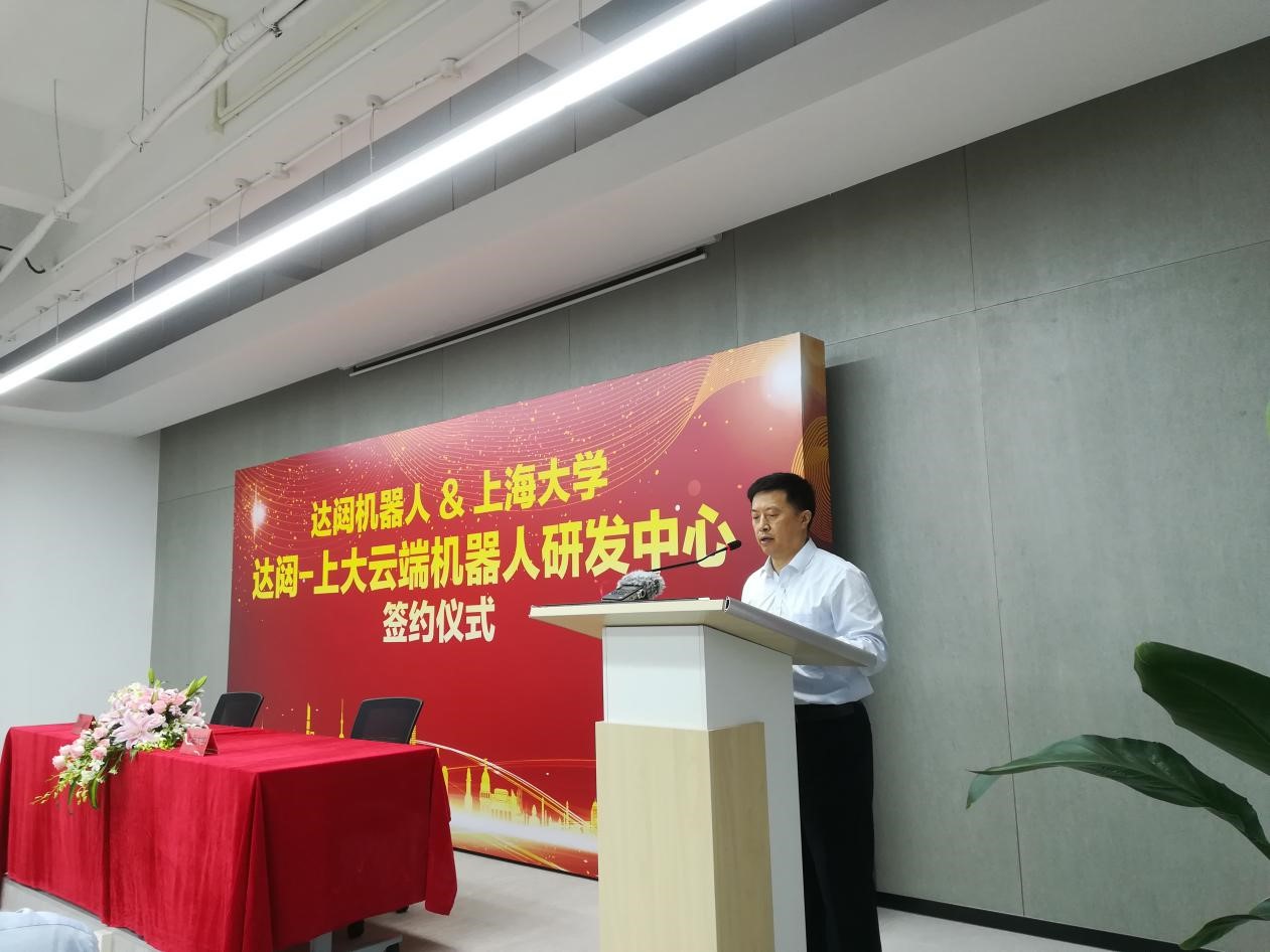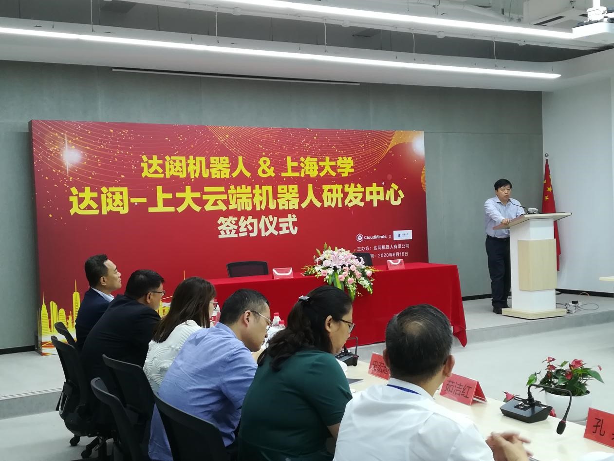 是我国最早开展机器人相关研究的高校之一。多年来依托上海机器人研究所和上海市智能制造及机器人重点实验室,致力于智能制造和机器人的基础理论研究和核心技术研发,取得了多项重要成果。学校现为上海市机器人学会秘书长单位、上海机器人产业技术创新联盟理事单位、上海市机器人行业协会理事单位、上海智能制造产业技术创新战略联盟成员。刘校长寄语研发中心重点做好三件事:依托综合性大学多学科交叉的优势和上海机器人研究所的多年研究积淀,联合达闼全球领先的云端技术资源,深化产学研合作;平台起到聚智聚才、薪火相传的作用,吸引更多国际知名的机器人与智能制造领域的专家合作,打造上海机器人产业的人才高地;为国家机器人事业培养更多优秀人才,服务于经济社会发展和产业转型升级。