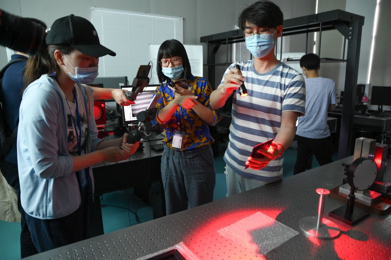 周文静老师和她的团队带领观众参观了该实验室研发出智能结构测试平台与文物材料微观裂纹数字全息成像系统,在测量领域与医工结合领域大显身手,大到测量大型的光学部件,小到观察细胞和微型的光学材料,上至航空飞行的智能监测,下至墙壁木板的传感控制,还有VR和AR技术助阵,简直是无所不能。