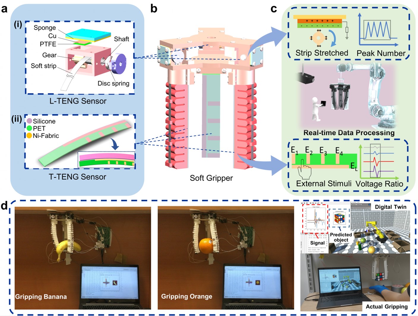 在本论文中,研究团队基于齿轮灵感设计了一种TENG长度传感器,为检测柔性手指弯曲形态提供了一种低成本、高可靠、自供能的传感方案;通过在柔性基底上布置5个形态不同的电极设计了TENG触/滑觉传感器,用于检测接触位置、面积和滑觉信息。将上述TENG传感器件集成到3D打印的柔性手上并开展抓取训练,优化学习模型,基于机器学习融合多传感信息实现准确、高效的物体识别。基于数字孪生技术将实时感知与识别数据映射到数字空间中,驱动孪生模型进行智能分拣。该研究结果为TENG传感和柔性机器人形态与触觉感知等相关领域研究提供了新思路,也为柔性机器人在多维信息融合的智能制造中应用提供了一种全新的解决方案。