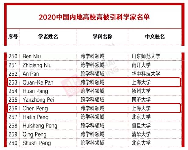 2020年188金宝搏中国官网 共8位教授上榜,入选人次数量列内地高校第20位,上海高校第3位。我院彭晨教授、潘全科教授入选此次“高被引科学家”名单。
