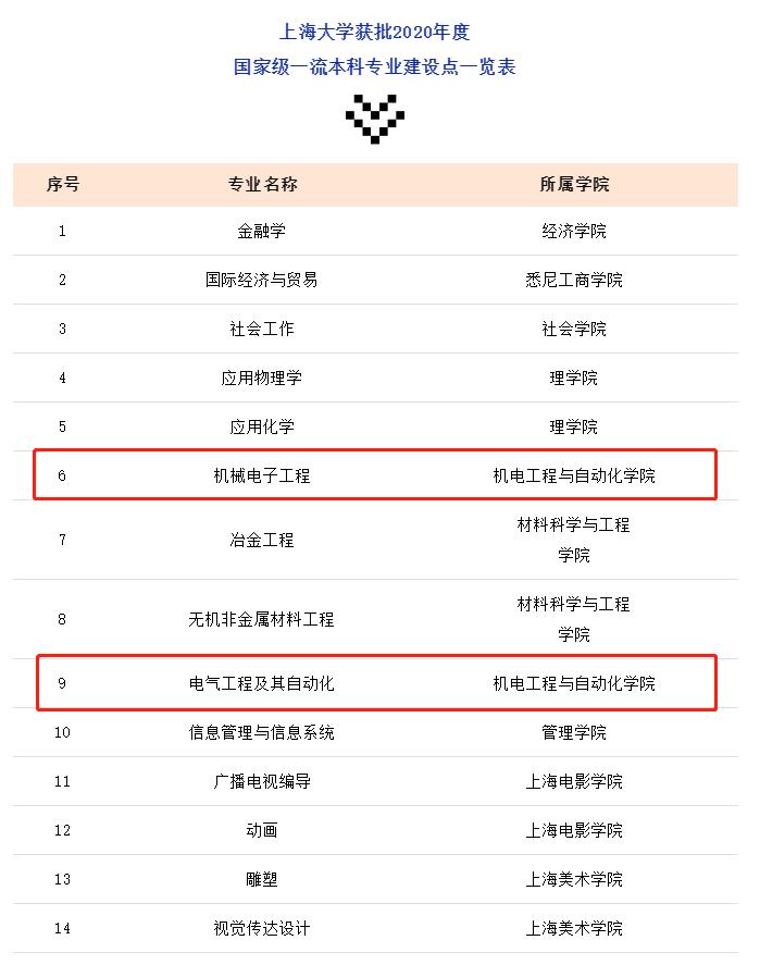 14个专业入选2020年度国家级一流本科专业建设点,其中机自学院机械电子工程,电气工程及其自动化2个专业入选。