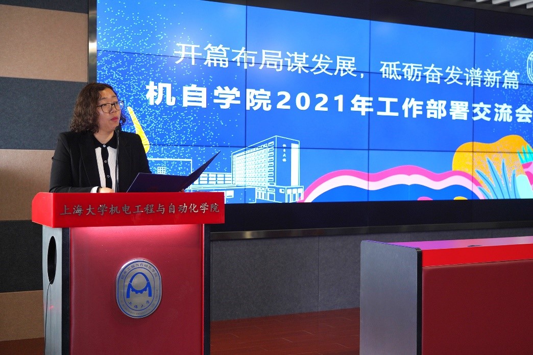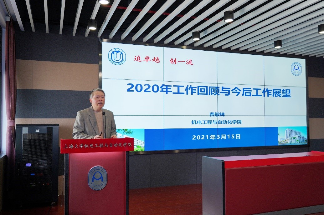随后,院长费敏锐作机自学院行政工作报告。费老师对学院绩效工作量、卓越指标完成情况和2020年工作亮点等进行了回顾。费老师强调要结合学院十四五发展规划、开局年的四大任务等,以党建为引领,以队伍为基础,以学科建设为中心,在人才培养、科学研究、社会服务、国际交流与合作等方面完成指标,做出亮点、特色。紧接着,学院各分管领导就2021年工作进行了部署和交流。