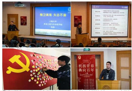 为庆祝中国共产党成立100周年,以“传承红色基因,激活红色中枢,释放红色能量,培养红色传人”为主题,机自学院结合学科特色,策划了“‘机’扬青春,‘犇’向百年”建党百年系列活动,该活动启动仪式于3月28日在J103讲堂举行。校学工办副主任汤琳夏,机自学院党委书记于瀛洁,党委副书记、纪委书记仇静豪,副教授、博士生导师杨扬,精海无人艇团队部分成员以及19级学生代表出席了本次活动。活动由院团委副书记张峰老师主持。