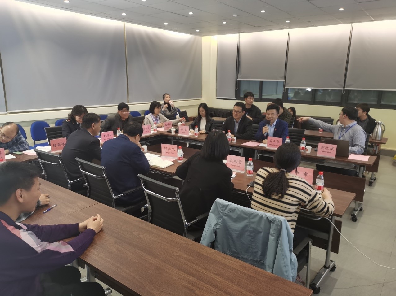 首先,机自学院副院长苗中华向专程到访机自学院的市、区市场监督管理局的各位领导表示诚挚欢迎。苗教授介绍了机自学院学科发展、科研成果以及标准化方面的进展和成绩,展望了学院以后的标准化建设工作。随后,由周歧斌老师对试点工作组组建情况进行了汇报,介绍了此次项目的背景,分享了自己在IEC工作组的工作经历以及取得的收获。强调压敏电阻因其广泛的应用背景,其产业发展是国家需要的。最后他汇报了标准化试点的工作情况,包括人员构成、成立试点的目的以及试点后续的计划安排。陆文俊教授和边晓燕教授对周歧斌老师的标准化工作成果表示了高度赞扬,并给出了相关的建议与指导,希望工作组做好长期工作的准备,加强培训教育与组织保障。