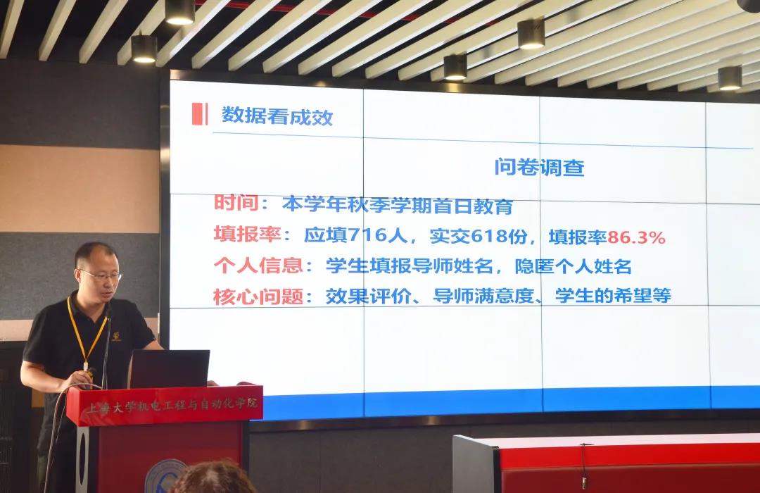 活动伊始,仇静豪老师围绕工作架构、工作内容等方面以大事记的形式汇报了上一学年学院全程导师工作取得的成绩,并就推进中遇到的四“不”痛点——“师生见面次数不足、沟通不畅、收获不多、冷热不均”与与会教师进行了交流。