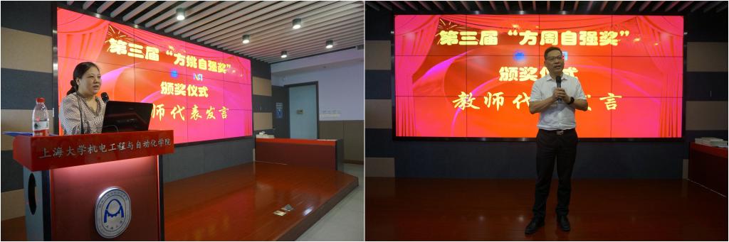 随后,获奖教师代表雷静桃、罗均,研究生代表刘洪飞、胡鹏,本科生代表王嘉黎、万高昂先后发表了获奖感言,表达了对设奖人姚毓林先生、周忻先生、方姚、方周自强奖的促成者方明伦教授以及学院资源平台、上海市智能制造及机器人重点实验室的感谢,并分享了个人在科研、工作与学习中的感想及展望。