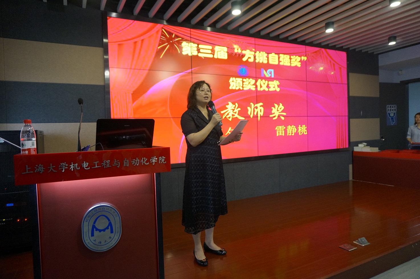 组织人事部副部长、人事处处长、上海市智能制造及机器人重点实验室主任刘丽兰,机电工程与自动化学院党委书记陈方泉,机电工程与自动化学院党委副书记、院长于瀛洁,机自系系主任田应仲,机自系党总支书记赵其杰,以及机自系师生代表等也出席了本次颁奖典礼。典礼由上海市智能制造与机器人重点实验室执行副主任沈南燕主持。