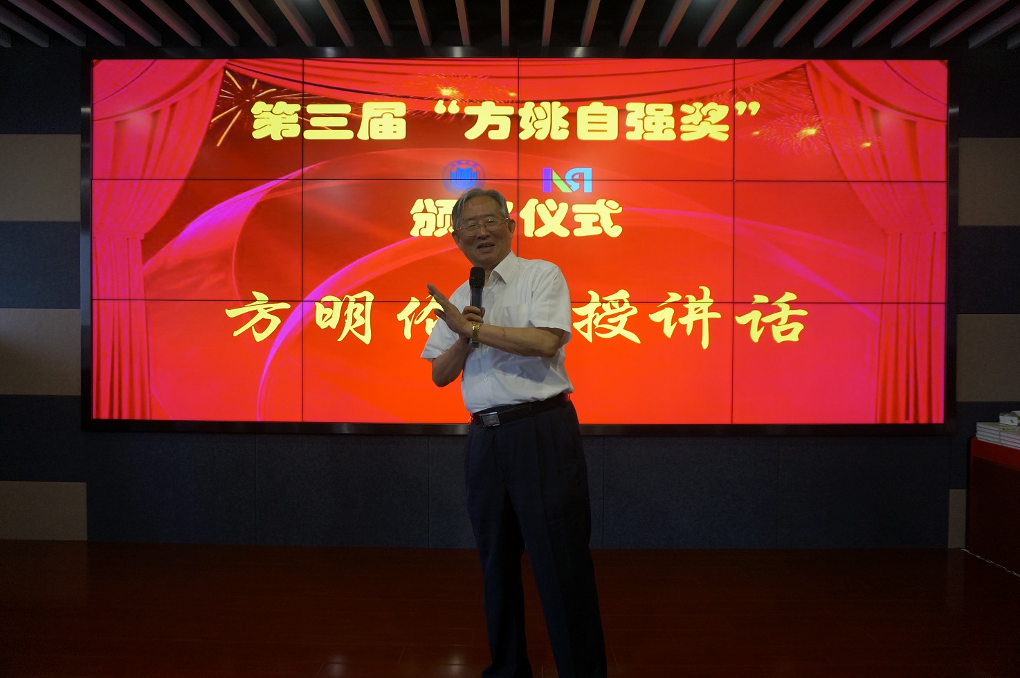 最后,学生代表为两位捐赠人赠送了纪念品。方明伦教授将书籍《耕耘者之道——方明伦教授八十人生历程》赠予获奖者们,并进行了总结发言,他表达了对到场嘉宾的感谢,并希望师生继续努力,积极促进学校在机器人、机械制造等相关学科上的发展,为建设双一流大学的目标共同努力奋斗。