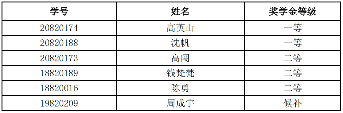 研究生“和宗焊接”奖学金评审条例》,机电工程与自动化学院成立研究生“和宗焊接”奖学金评审委员会。经个人申报、班级初审、学院复审、评审委员会无记名打分,评选出机电工程与自动化学院研究生“和宗焊接”奖学金候选人。结果如下: