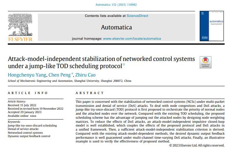机自学院网络化控制中心直博生杨宏晨予同学在其导师彭晨教授和曹智茹老师指导下,在网络资源安全调度领域取得重要进展。相关研究论文“Attack-model-independent stabilization of networked control systems under a jump-like TOD scheduling protocol”以“Regular Paper”发表于自动化领域国际顶级期刊《Automatica》(152(2023)110982,影响因子:6.15)上,188金宝搏中国官网