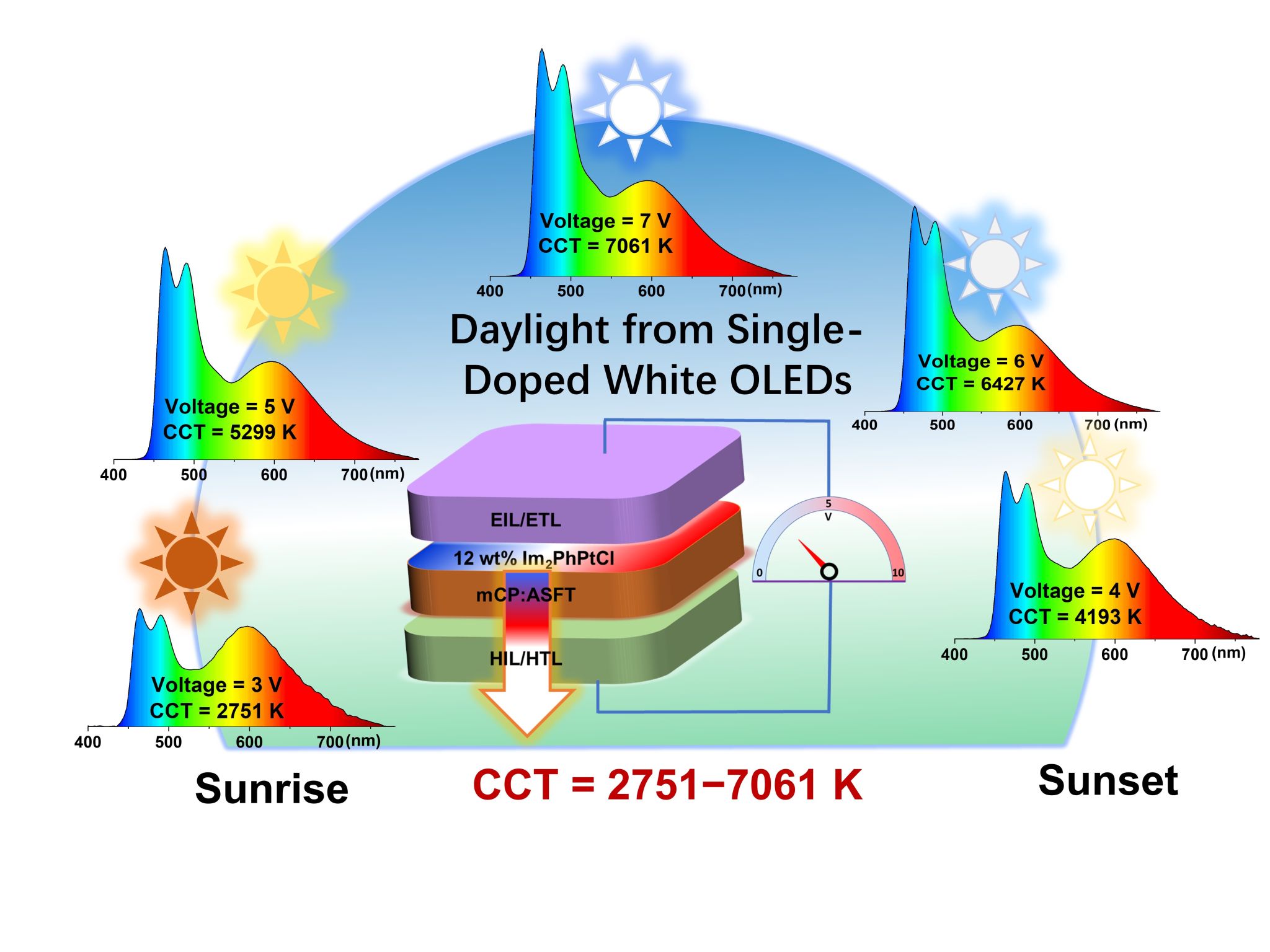 该工作利用甲基基团调节铂(II)金属配合物的Pt∙∙∙Pt相互作用,从而实现色温(CCT 2751−7061 K之间)可调、高显色指数、高效率低滚降的白光OLED。通过简单地改变驱动电压,此白光OLED可以模拟太阳从黎明日升到黄昏日落,为未来人们在室内享受日光浴提供了研究基础。新型显示重点实验室王子兴副研究员和德国卡尔斯鲁厄理工学院(KIT)的Stefan Bräse教授为共同通讯作者,188金宝搏中国官网
