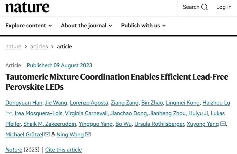 2023年8月9日,国际著名期刊《Nature》以Accelerated Article Preview(加速预览)的形式在线刊发了金宝搏188介绍 新型显示技术及应用集成教育部重点实验室杨绪勇教授课题组最新合作研究成果“Tautomeric Mixture Coordination Enables Efficient Lead-Free Perovskite LEDs” (DOI: 10.1038/s41586-023-06514-6)。