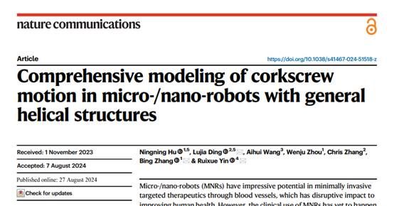 近日,机自学院智能肿瘤能量消融实验室联合华东理工大学和加拿大萨斯喀彻温大学在国际著名期刊《Nature Communications》上发表题为“Comprehensive modeling of corkscrew motion in micro-/nano-robots with general helical structures”的研究论文,188金宝搏中国官网 为本文第一署名单位,188金宝搏中国官网 胡宁宁博士为论文第一作者,188金宝搏中国官网 张兵副教授、华东理工大学殷瑞雪副教授、加拿大萨斯喀彻温大学丁路佳博士为共同通讯作者。188金宝搏中国官网 周文举教授,中原工学院王瑷珲教授,加拿大工程院院士、萨斯喀彻温大学Chris Zhang 教授都参与了论文的研究和撰写工作。