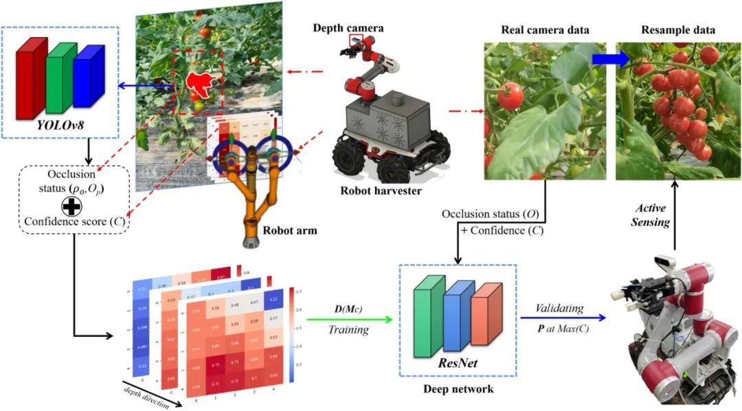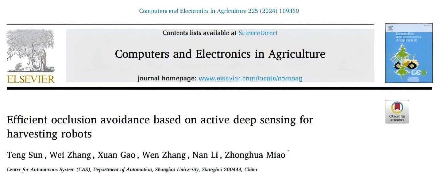 近日,机自学院苗中华教授团队在农业自动化领域国际著名期刊《Computers and Electronics in Agriculture》(中科院一区TOP期刊)上发表题为“Efficient occlusion avoidance based on active deep sensing for harvesting robots”的研究论文。