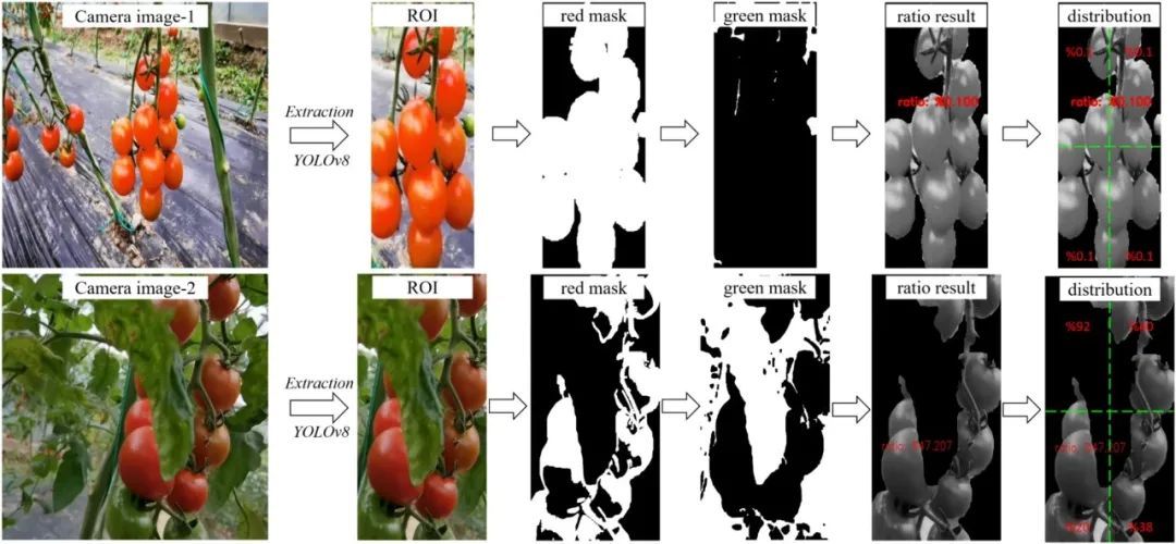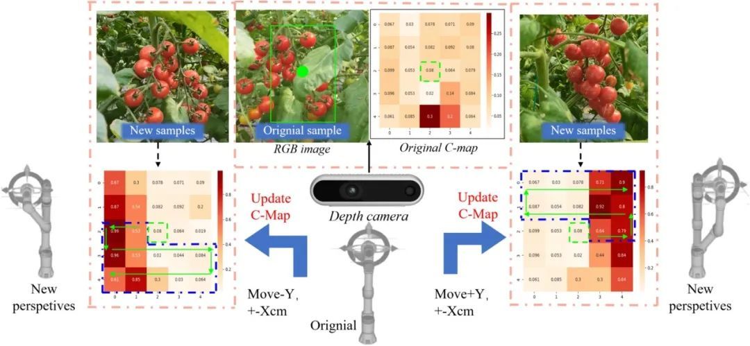 首先,通过分割网络提取目标的感兴趣区域,然后利用图像处理方法获取目标的遮挡状态。以当前观测位置为起点,在矩阵内移动摄像头,形成置信度和遮挡率分布图。在建立了一系列遮挡率和置信度矩阵数据集后,训练了一个设计好的深度网络,用于在估计当前遮挡状态后预测置信度最高/遮挡率最低的位置。为了验证该方法的可靠性,针对苹果和成簇的番茄进行了实验室和田间实验。