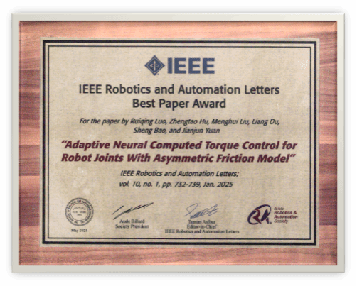 袁建军教授团队凭借其在机器人关节控制领域的研究成果发表论文“Adaptive NNeural Computed Torque Control for Robot Joints With Asymmetric Friction Model”,获得国际机器人领域顶级期刊《IEEE Robotics and Automation Letters》(RAL)2024年度最佳论文奖(Best Paper Award)。RAL是IEEE机器人与自动化协会(IEEE Robotics and Automation Society, RAS)于2015年推出的机器人领域权威期刊(中科院2区Top期刊,JCR Q1区,影响因子4.6),期刊每年于全球1500多篇发表文章中仅评选五篇最佳论文奖。该奖项于2025年5月19日至5月23日于美国亚特兰大举办的IEEE国际机器人与自动化大会(2025 IEEE International Conference on Robotics and Automation)正式颁发。机自学院机自系博士生罗瑞卿为论文第一作者,188金宝搏中国官网