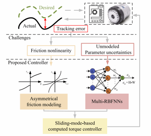 该研究针对机器人关节动态特性的非线性和不确定性,提出了一种创新的自适应神经网络计算力矩控制方案。该方案融合了一种新的参数化非对称摩擦模型(考虑速度、负载与温度依赖效应)与多个并行分布训练的非参数化径向基神经网络(MRBFNNs)实时补偿框架;并通过提出的非对称摩擦力模型与滑模方法协同设计,有效抑制了扰动波动边界层,实现了全局渐近收敛。实验证明,非对称模型在摩擦方面显著提高了与现实的对应性;所提出的控制策略展示了具有可变有效载荷的关节的卓越跟踪性能。