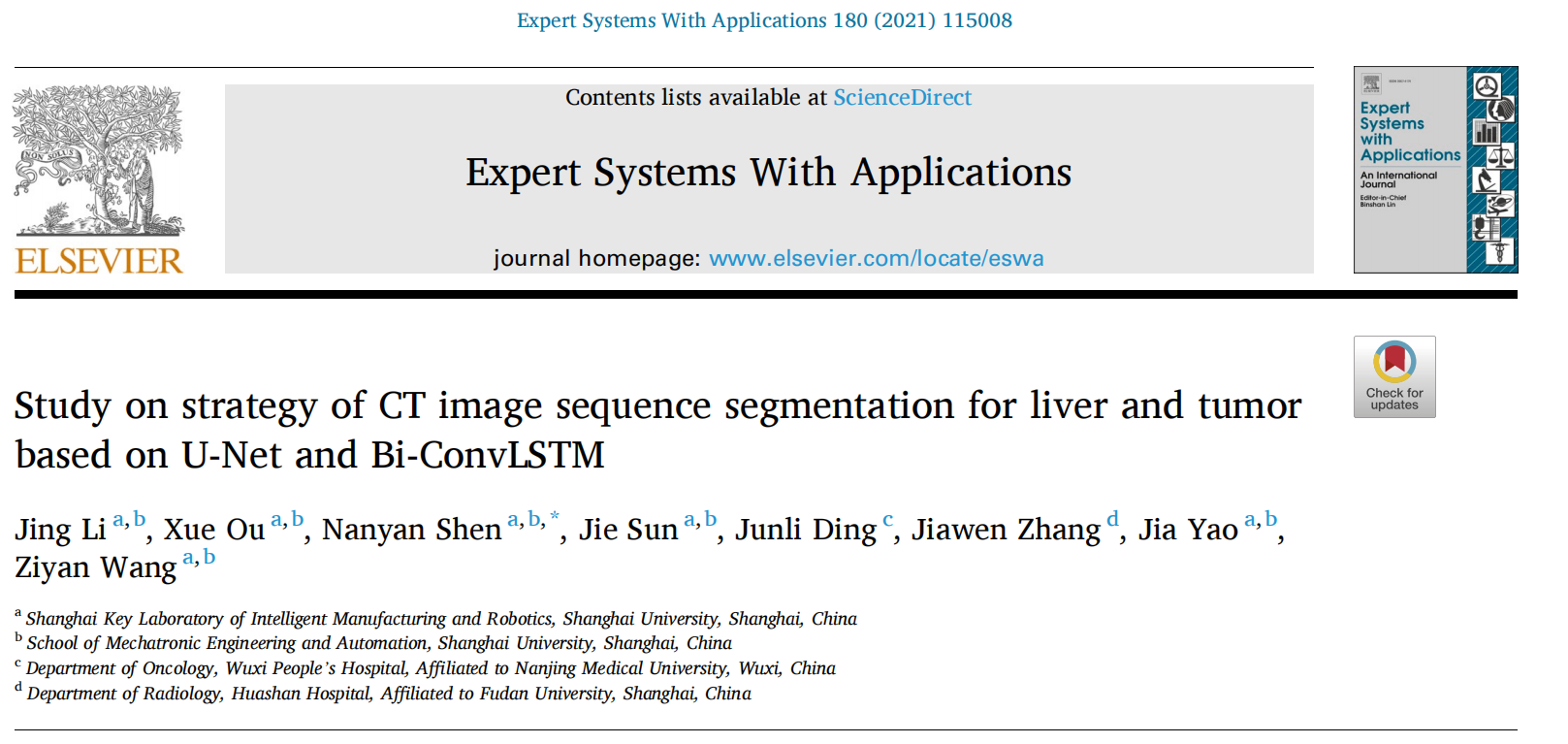 机自学院机械自动化工程系李静副教授、沈南燕副教授及其团队在人工智能领域的研究成果“StudyonStrategyofCT ImageSequenceSegmentationforLiverandTumorBasedonU-netandBi-ConvLSTM”在SCI一区(计算机科学)TOP期刊《ExpertSystemsWithApplications》(ESWA,CS=11.0,IF=5.452)上公开发表,188金宝搏中国官网