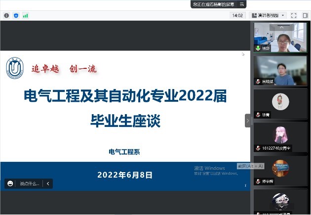 6月8日下午,电气工程系举办2022届毕业生代表座谈会。电气工程系直属党支部书记周歧斌,系副主任杨影、赵剑飞,2022届毕业班辅导员孟蓉,系本科教学秘书毕青以及毕业班学生代表等参加了此次座谈会。